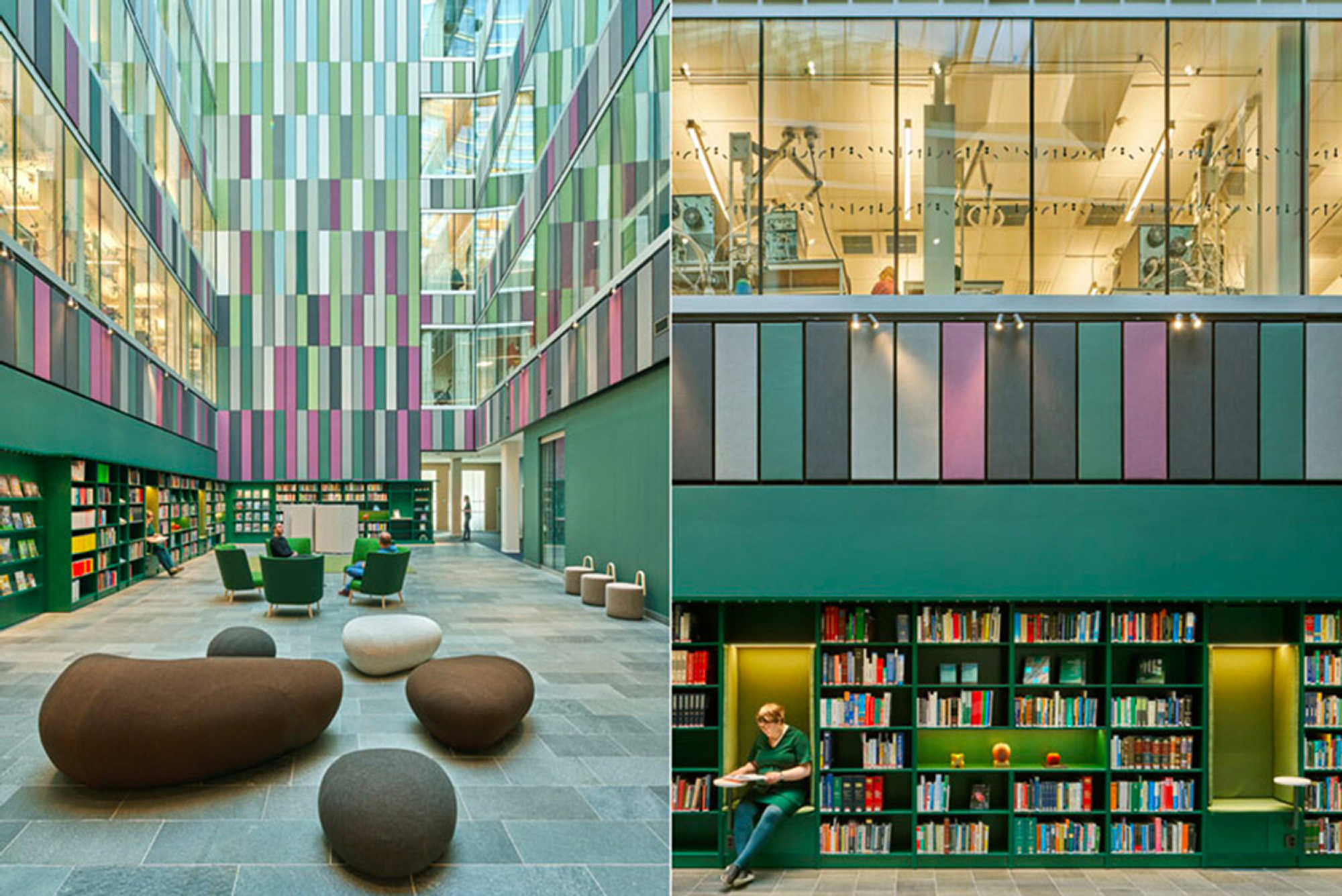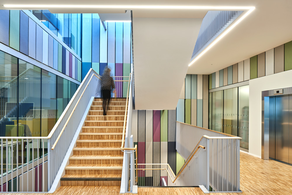 Ein dimmbares Lichtsystem simulierte Tageslicht, während Akustikpaneele aus EcoSUND® von Akustikmiljö integriert wurden. Diese Lösung, entwickelt in Zusammenarbeit mit Aros Akustik, ersetzte eine zunächst geplante, teure Holzkonstruktion. Die leichten Paneele konnten mit Klettverschlüssen auf Stahlprofilen montiert werden – kostengünstig, akustisch wirksam und ästhetisch ansprechend.