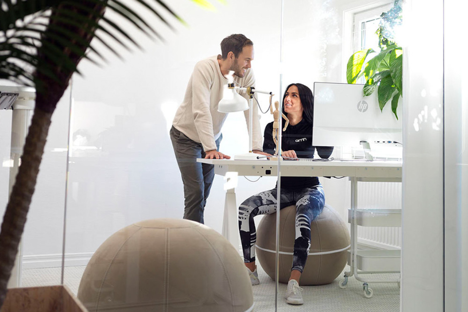 Gym in the warehouse, workout gear as dress code and Pilates balls as office chairs. At Aim’n in Halmstad, the office has been designed to reflect their business model.